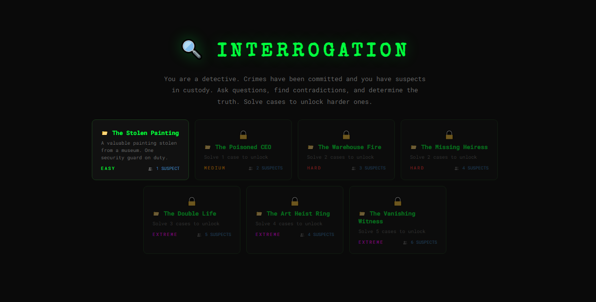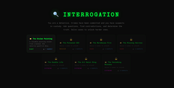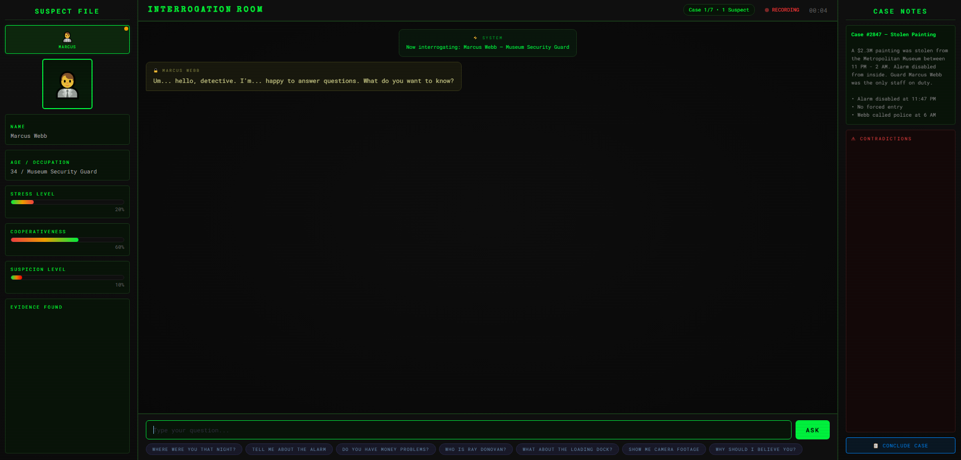 Each suspect has their own personality, their own motives, and their own secrets, which they may try to conceal, lie, evade, or even try to deceive you with. It is your job to interpret their words, identify their contradictions, and take advantage of their vulnerabilities. Your style of interrogation, whether hard, soft, or smart, will determine how they respond.
